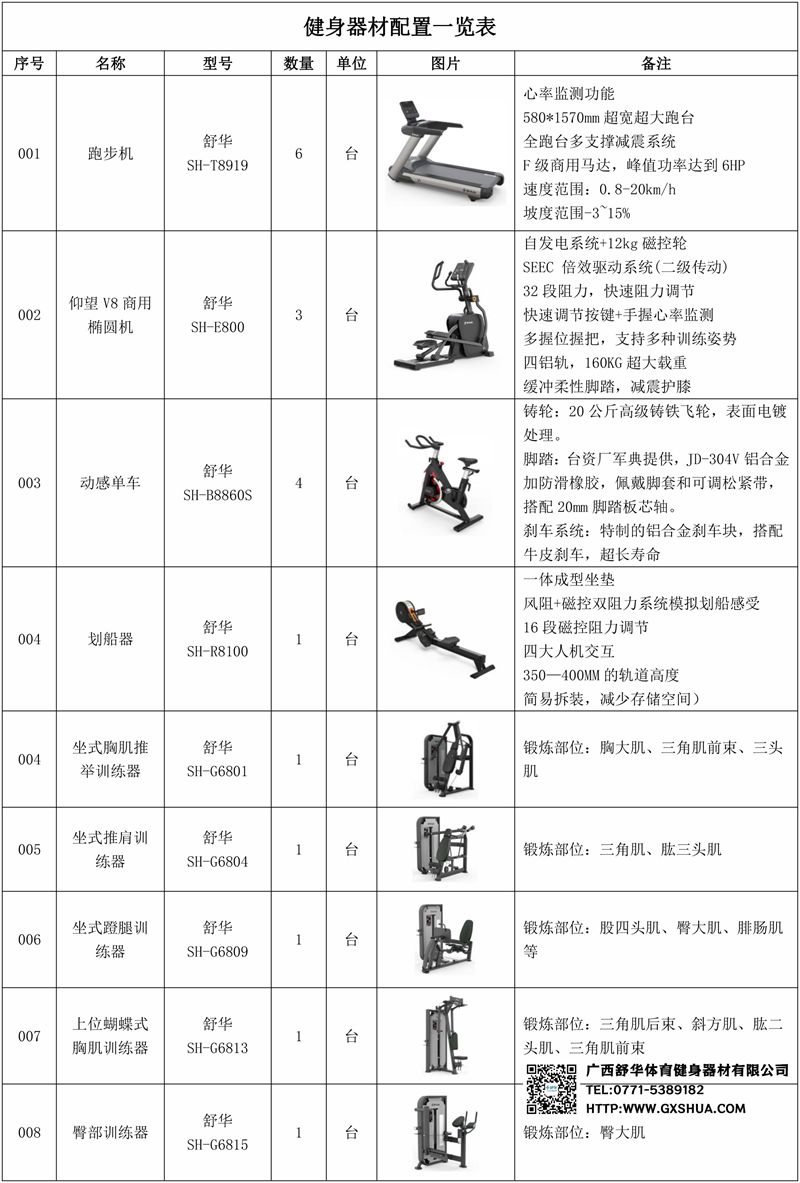 1.壹号娱乐V9智能跑步机SH-T8919*6台-独立仪表-简洁大气,全新外观设计,健康运动新选择;心率监测功能,可通过手握心率、无线心率带等不同方式实时采集心率数据;580*1570mm超宽超大跑台-跑感舒适,跑台整体安全稳定;全跑台多支撑减震平台,保证跑台超强支撑力,达到180kg支撑,满足专业健身房需求。F级商用马达-超强马达,AC 3.0HP 交流,峰值功率达到6HP,F级商用品质。速度范围达到0.8-20km/h;V9跑步机可实现跑台扬升功能,坡度范围-3~15%,满足客户不同的锻炼需求。